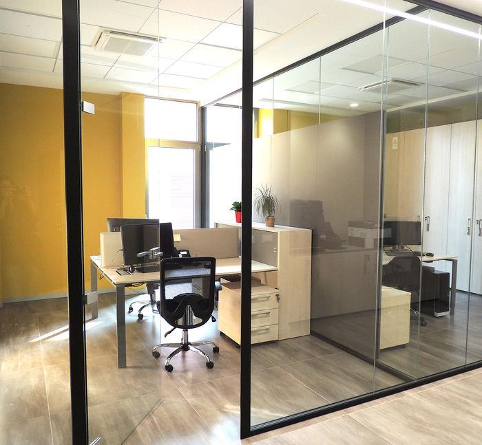 L'utilizzo delle partizioni con vetrate monolastra hanno consentito di creare spazi ben definiti ma nello stesso tempo di avere una visione d'insieme dello spazio e del passaggio della luminosità.